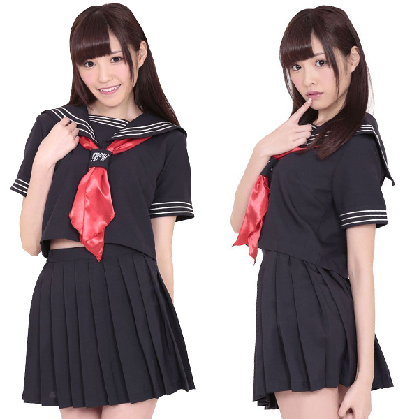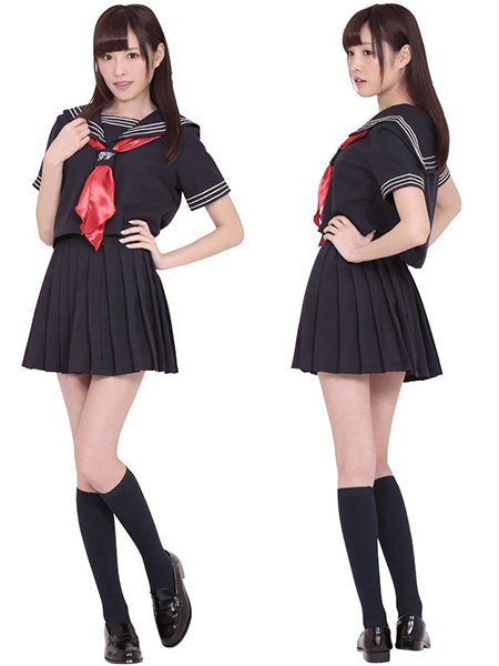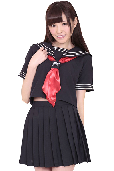 制服コスプレの定番!紺地に3本ラインの入った半袖セーラー服です。このセーラー服は、スカーフ留めに文字が入ったお嬢様学校仕様!赤と白のスカーフ付きですので、どちらかお好きな色で女子高生コスプレを楽しめます。