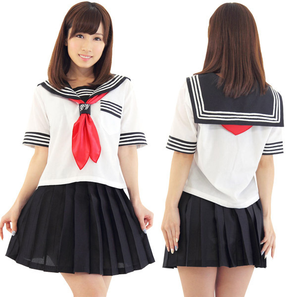赤いスカーフがポイント!人気の定番セーラー服コスプレ(L)。涼しげな夏服仕様の半袖タイプ!セーラー襟や袖のオーソドックスな3本ラインでリアル感を演出!ミニ丈のプリーツスカートがちょっぴりセクシーなスクール系コスチュームです。※LLサイズ(b17522)あります。