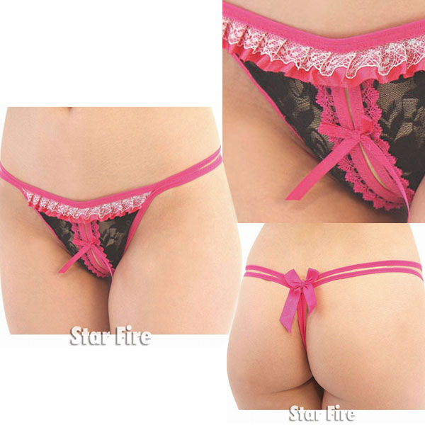 <EROX>クロッチ部分にスリットを入れた、ローズ×黒のセクシーオープンショーツ。前面は黒い花柄レースにローズ色のフリル飾りをあしらい、差し色として白レースのフリルをプラス!優しい雰囲気の下着に整えました。後姿は2本のストリングスでかっこよく!フロントとバックにリボンをつけて、可愛くセクシーなGストリングに仕上げました。