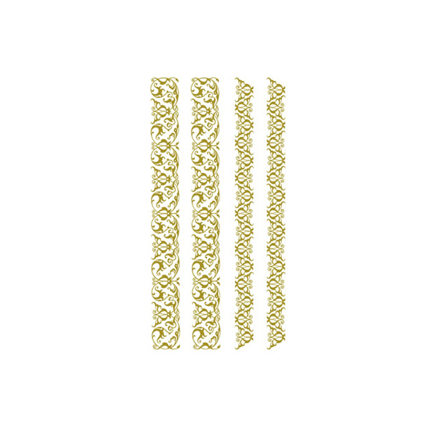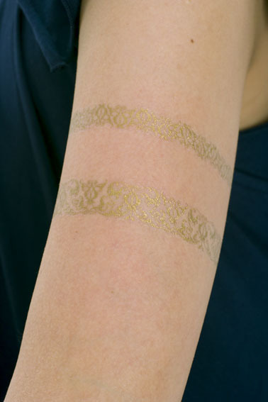 イベントやお祭りに大活躍!レギュラーサイズのタトゥーシール「腕輪・金ゴシック」。コスチューム等に合わせて露出した肌に貼り付けるだけ!特殊な素材を使用しているので皮膚の動きと一緒に伸び縮みし、入浴したり海やプールに入っても2〜3日は取れません。祭り化粧を取る際は、専用のクリーナーやクレンジングクリーム、ベビーローション等で拭き取って下さい。