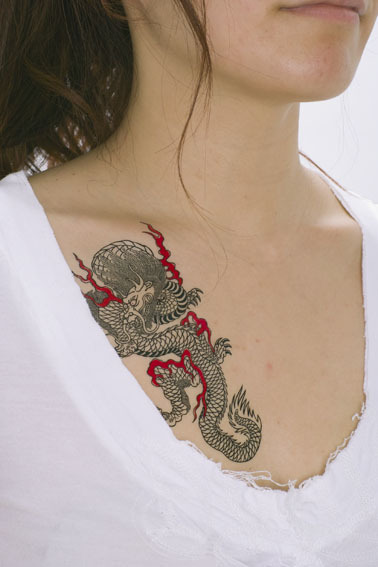 イベントやお祭りに大活躍!レギュラーサイズの刺青シール「線画・黒ドラゴン」。コスチューム等に合わせて露出した肌に貼り付けるだけ!特殊な素材を使用しているので皮膚の動きと一緒に伸び縮みし、入浴したり海やプールに入っても2〜3日は取れません。祭り化粧を取る際は、専用のクリーナーやクレンジングクリーム、ベビーローション等で拭き取って下さい。