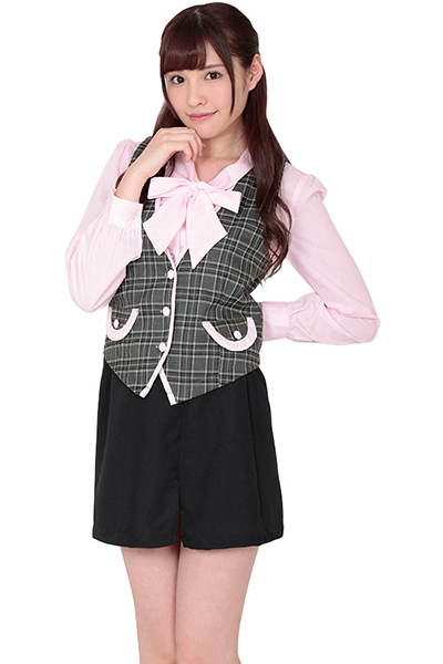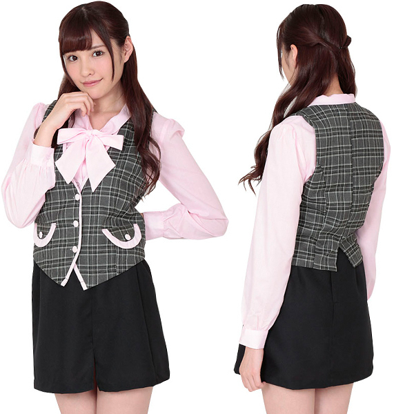 存在感のあるピンクのボウタイブラウスがキュート!モテかわ系のOLコスプレ衣装。タイトスカートはスリット入りでセクシーに!グレーのチェックベストには、長袖ブラウスのカラーにあわせたパイピングを施しました!フェミニンなオーラを放つOLコスチュームです。