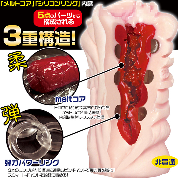 肉厚の外壁&トロトロ膣内素材の間に、3つのリングを内蔵した新発想のオナホール。肌色の側面にもビラビラを刻み込み、ちょっとしたグロさをアピール!膣括約筋・Gスポット・ポルチオにある、3つのパワーリングの弾力で、まるで三段俵締めの名器のような吸い付き&締め付けを味わえる、非貫通型・無次元オナホールです。ペニスが欲しくてたまらず、欲情しちゃったアソコをご堪能ください!