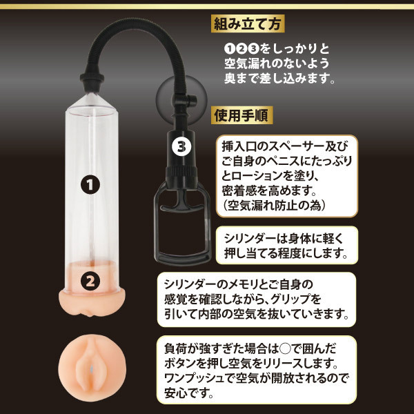 日々の成長を実感!手動式のペニス増大ポンプ「ビギナーベーシックペニスポンプ」。オナホールのような挿入口の装着パーツが肌に密着して、安定感のある吸引を実現。メモリ付きのシリンダーや、空気を瞬時に開放出来るワンプッシュの空気抜きボタンなど、便利機能を搭載した安心設計。初心者の方でも気軽にお使い頂けるチントレグッズです。