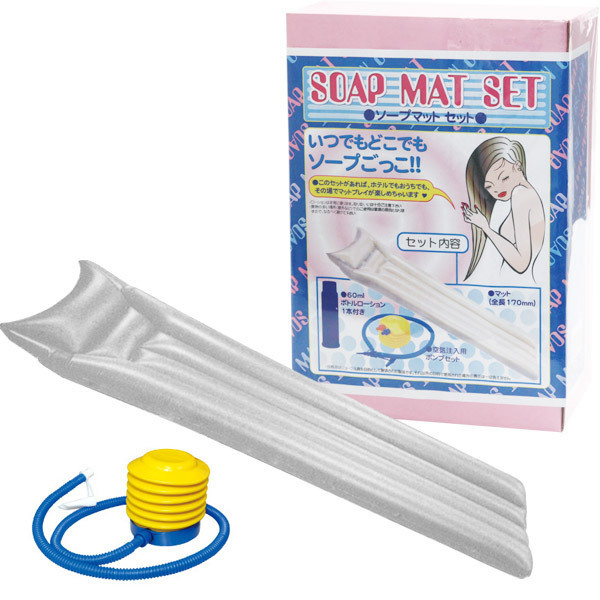 風俗マニア&マンネリカップル必見!自宅でソープランドのマットプレイが再現できる簡易式ソープマットセット。●エアーマット(白)&空気注入用エアーポンプ&ミニボトルローション(60ml)●マットサイズ170cm×55cm●ビニールシートを敷けばレジャーにも使用可能。これさえあればお家でもホテルでも簡単に本格的なマットプレイをお楽しみいただけます。「最近ちょっとマンネリ気味だな〜」と感じ始めたカップルや、風俗に興味のある方はぜひパートナーと一緒に雰囲気を楽しんでみてはいかがでしょうか。