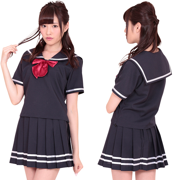 プリーツスカートのダブルラインがカッコいい!濃紺セーラー服コスチューム。●光沢のある細いリボンをラインに採用●襟と袖口は1本線・胸当てなしのシンプルな半袖トップス●襟元へ付属の赤リボンを装着してアクセントに・既に持っているスカーフを結んでもOK。ミニスカ&ニーソックスのコラボで無敵の絶対領域を作り出すコスプレ衣装です。※靴下は付属しません。