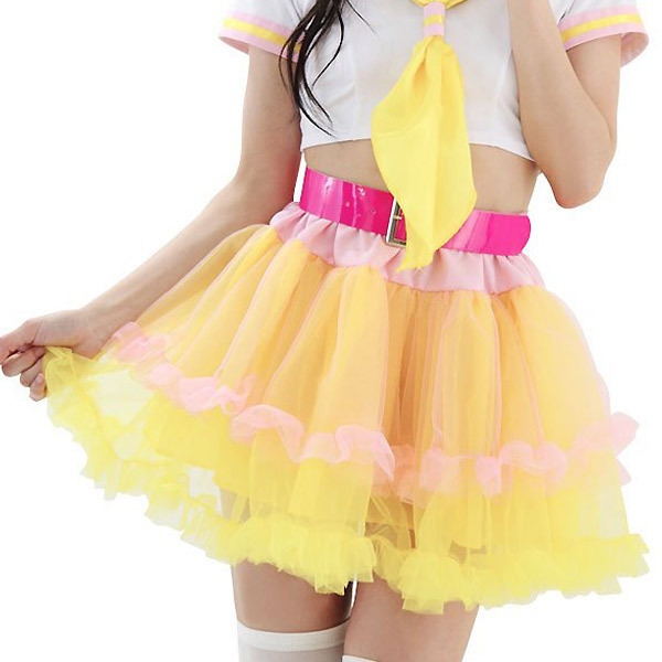 アイドル風コスチュームやセーラー服コスプレのお供に♪黄色×ピンクのキュートなカラフルパニエスカート。●優しいイエロー×ピンクカラー●たっぷりフリル!ボリューミーなスカート●オシャレのアクセントになるベルト(ビビッドピンク)●Mサイズ…B78〜88cm・W58〜70cm・H87〜95cmに適応。明るく楽しい気持ちになる可愛さ満点のコスプレアイテムです。※セット内容以外は付属しません。