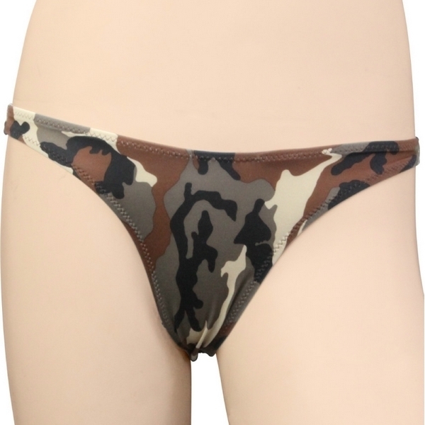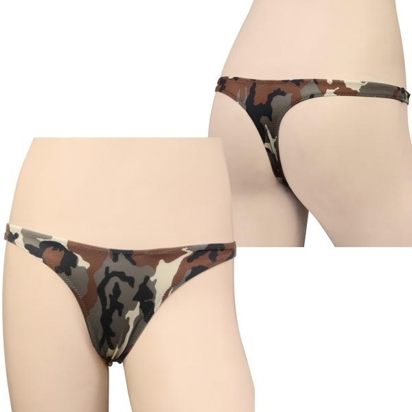 ミリタリー女子の魅せパンにも♪全面プリントの迷彩柄レディースTバックショーツ。●ブラウン系のカモフラ柄ショーツ●ストレッチ生地で上下左右に伸縮●ボディにフィットして着心地抜群●セクシーなTバックタイプ●女性用Mサイズ・日本製。カジュアルなカモフラージュ柄を全面にプリントした、ワイルド&セクシーなランジェリーです。