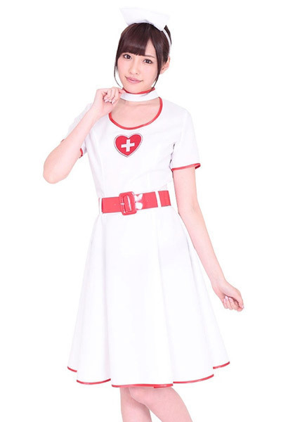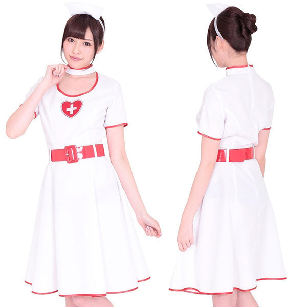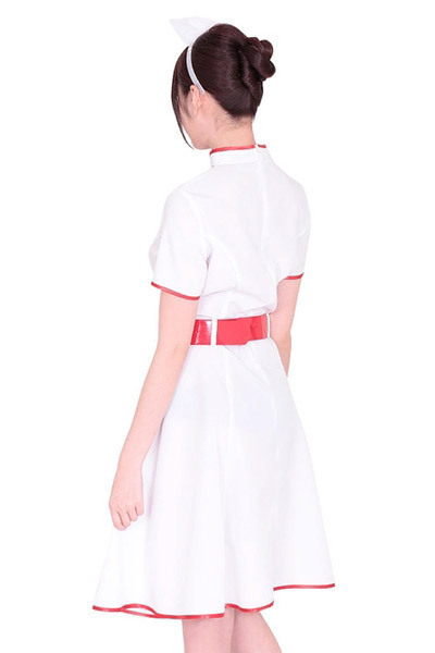 ふんわりフレアなシルエットで上品に♪クラシックなワンピースデザインのナース服&ナースカチューシャのセット。清潔感のある白をベースに、パイピングとウエストベルトの赤をアクセントにした半袖ワンピース!チョーカー風になったラウンドネックの首元と、胸元を飾る十字のハートマークもポイントです。※セット内容以外は付属しておりません。