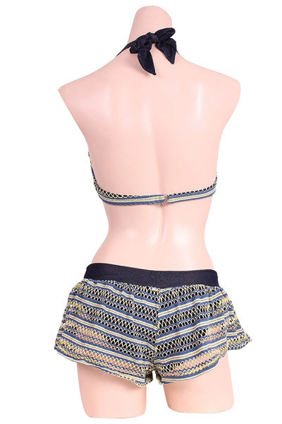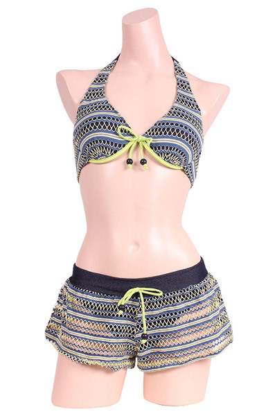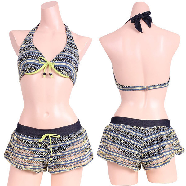 ビーチで周りと差をつける、黄緑とネイビーの本格スイムウェアシリーズ♪ショートパンツありなしで2テイスト楽しめる3点セット。気分でフレキシブルに着替える事が出来る優れもの。デニム風合いのストレッチ生地と2色使いのネットボーダー生地を重ねてレディだけどカジュアルなバランスが素敵。パイピングとチャームのアクセントも絶妙です。※こちらの商品は受注発注商品の為、ご注文から発送までに3、4営業日掛かる場合が御座います。
