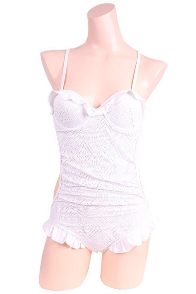 フェミニンレース2枚仕立てワンピーススイムウエアー ホワイト