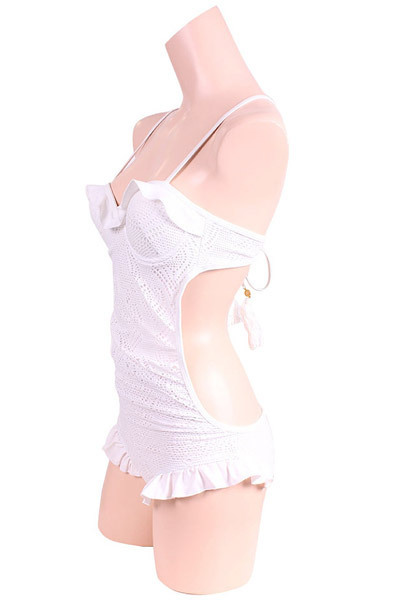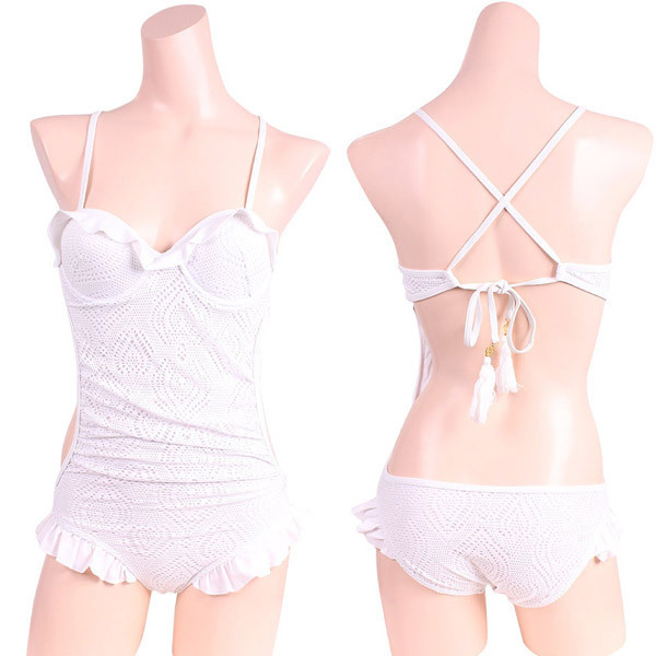 純白のビーチで周りと差をつける、本格スイムウェアシリーズ♪フェミニンなストレッチレースの重ねた2枚仕立てのワンピース。胸元と足ぐり部分にはフリルを付けてコンサバなキレイめを狙ったデザインです。胸元からのループを背中でクロスして結ぶようになっています。先端にはゴールドのモチーフとホワイトタッセル付きでモード感倍増!※こちらの商品は受注発注商品の為、ご注文から発送までに3、4営業日掛かる場合が御座います。