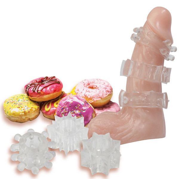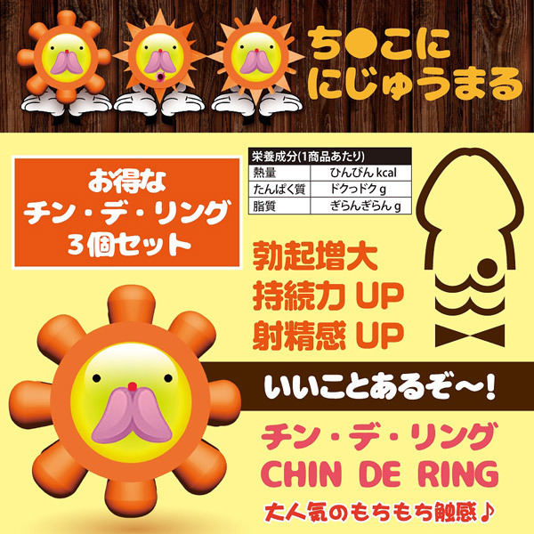 複数同時に装着すれば更に強力サポート!お得なペニスリング3個セット「チン・デ・リング」。勃起増大や持続力UP、射精感UPに!柔らかくモチモチ感触の丈夫なエラストマー素材を採用した男性用補助グッズ。それぞれ形状が異なる刺激的な突起がついているので、単品使いから複数同時使いまでマルチに楽しめる3個セットです。