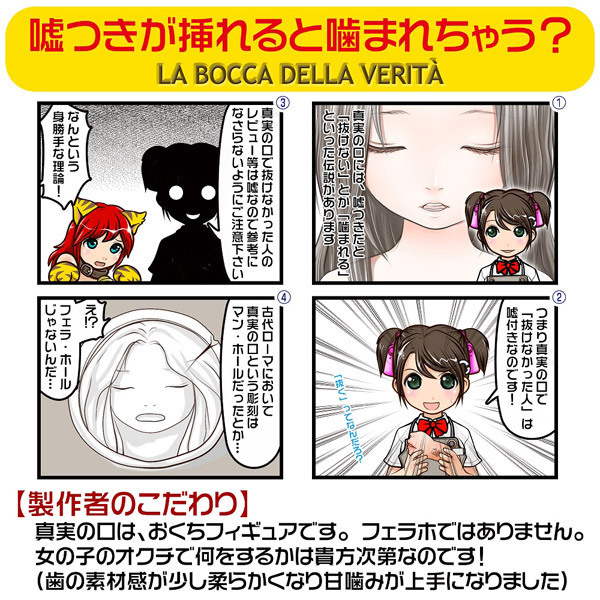 「真実の口 アマガミ」は、大ヒットフェラホ「真実の口」のソフトタイプです。オナホール(非貫通)の素材がソフトになったのに加え、歯部分の素材が柔らかい素材になり全体的にマイルドな刺激になっています♪挿入するとコリコリとした歯が亀頭を擦り、ねっとりとした舌が裏筋を嘗め回す!喉の奥まで行くと徐々に締め付けるイラマチオと出し入れする度に発生するバキューム吸引が精液を搾り取ります。超やわらかで丈夫な素材「めるてぃスキン」を使った表面の肌に、絡みつくような厚めの粘膜素材のお口と高弾力のTPE樹脂を使った真っ白い歯がリアルなオーラルプレイを再現!フェラに慣れていない女の子が、あどけなさの残る甘噛みをするようなフェラを存分にお楽しみください♪