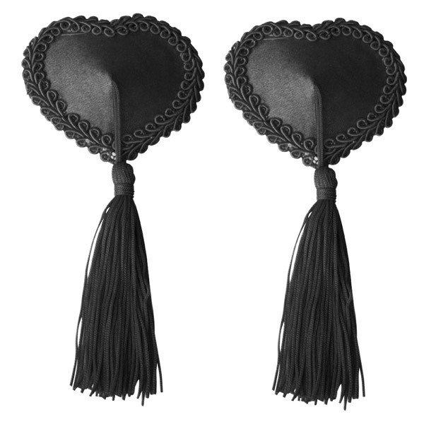 ピタッと貼るだけの簡単仕様♪バストトップ(乳首)に貼るだけで、手軽にオシャレが楽しめる下着感覚のニップルジュエリー「ニップルタッセル フリルサテンハート 黒」。複数回使用できる強力粘着シールタイプのボディアクセ。上品な光沢感のサテンを美しい装飾で縁取ったハート型ニップルと、ゆらゆら揺れるタッセルを組み合わせたゴージャスなデザインは、ショータイムやナイトパーティーにも最適です。