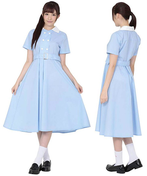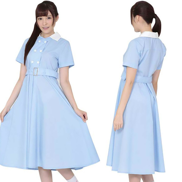 さわやかな印象を与えてくれる女子高生ブレザーの制服コスプレです。清楚なパステルブルーのカラーに白襟が、上品な印象と少女らしさを兼ね備えた可愛らしさを演出してくれます!ワンピースタイプでふんわりと広がるガーリーなスカートは、自然なスリットも入っていて学生気分に浸りたいときにもオススメ。襟には真っ白な6つのダブルボタンが付いているため、アニメに出てくる制服のような可愛らしさを併せ持っています!イベント用としてもどうぞ。