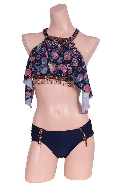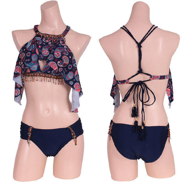 デザインがお洒落!深みのあるネイビーのペイズリーとエスニックビーズの組み合わせで誰よりも印象的に。ループの先にはゴールドの金具を4個あしらい先端のフリンジで軽やかな雰囲気。ビーズの色に合わせたじゃガード織テープを6カ所に配置しました。※こちらの商品は受注発注商品の為、ご注文から発送までに3、4営業日掛かる場合が御座います。