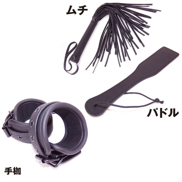 パッケージ:26.0×35.9×6.0cm セット内容:首輪、ボールギャグ、アイマスク、足枷、パドル、ムチ、手枷