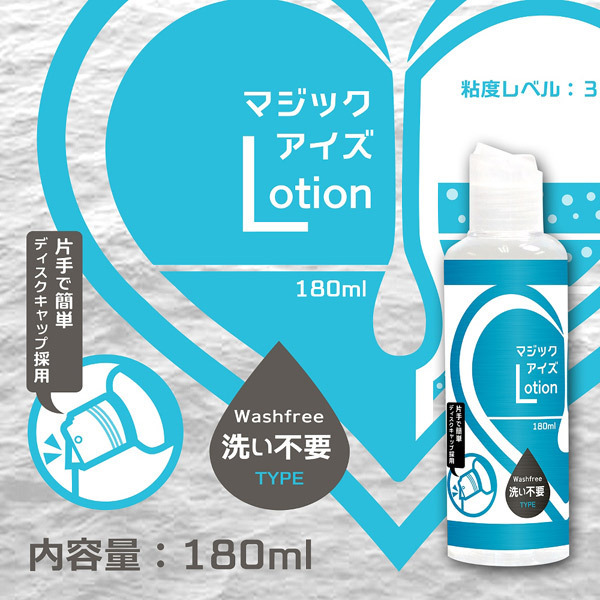 ふき取るだけで処理できる!無味・無臭のローション「マジックアイズローション 180ml(洗い不要)」。遠方にも携帯しやすいサイズで、さらに透明ボトルだから残量もすぐに確認できちゃう♪ディスクキャップを採用しているから、蓋も片手で簡単に開けられて使用する際に手間取ることもありません。安全性の高い成分「ヒドロキシエチルセルロース(粘度を高める成分)」を配合していて、主にヘアケア商品やマスカラなどの化粧品に配合されている成分だから、安全性にも優れた安心の商品となっております♪伸びは軽く、糸引きは軽めではありますが、使用後に洗う面倒もないので手軽にローションを使いたい方にはオススメの商品です!