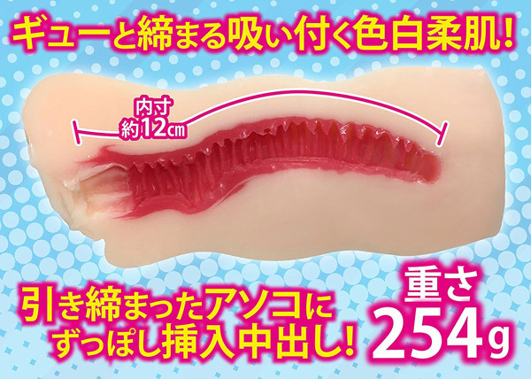 引き締まった女子大生チアガールのアソコを再現した生中出し感覚を楽しめるオナホールです!チアリーディングで鍛えたボディをイメージさせる美肌ボディは、抜群のさわり心地でウェーブが入っているので握りやすくストロークの際に疲れを感じさせません♪外観は、むっちりとした白い柔肌の美肌ボディで内部は、赤く色づいた膣内となっており、ギュンギュン絡みつく極上ヒダ名器を再現しています。内寸は、約12cmで適度なウェーブが入っているので奥へ行く程、狭くなりキツ感もしっかり感じられます!