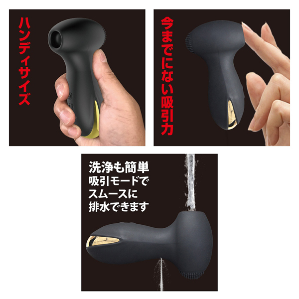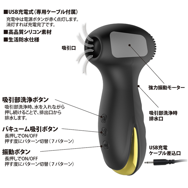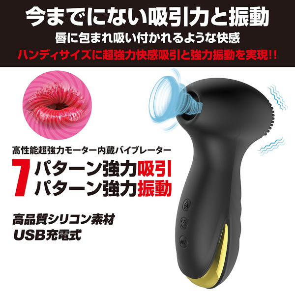 ハンディサイズなのに超強力な吸引バイブ。7種の吸引力と7種の振動パターンでクリトリスを吸い上げパワフル振動!唇に包まれ吸われるような快感が貴女を絶頂へと導きます♪吸引口の後ろ側にはモーターを内臓、表面の細かな突起で乳首や好きな箇所をピンポイントに刺激して楽しむのも有り!また、使用後の衛生面が心配という方も安心な生活防水付きで、吸引口から水を入れて洗浄することも可能。排水機能もしっかり備わっており、使った後はお手入れして清潔に保管していただけます♪USB充電式(専用コード付)、高品質なシリコン素材を使用しています。