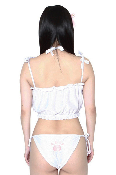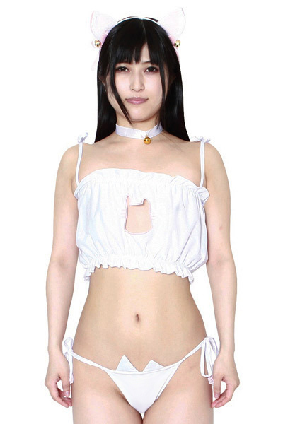 着るだけで甘え上手になれそうな真っ白で可愛い白猫コスプレ。胸元を猫マークにくり抜いたふんわりシフォンのトップスと、いたるところに可愛らしいネコモチーフを取り入れた紐パンツ、そして鈴付きの猫耳カチューシャの3点セット!エロと可愛さを両立させたとってもキュートなキャットガールコスチュームです。