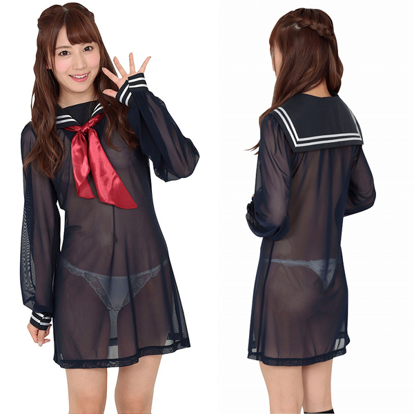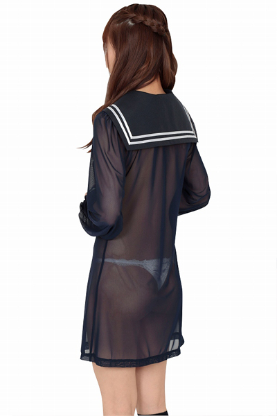素肌ががっつり見えちゃうスケスケ仕様!シースルー生地で仕立てた紺のセーラーワンピース。夜を盛り上げる透け感たっぷりなセーラー風のミニスカワンピで大胆セクシーにアピールします♪