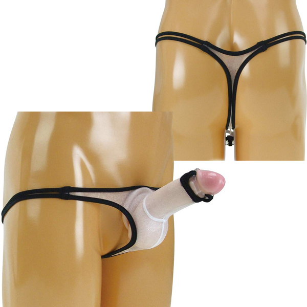 極薄のメッシュ地を黒パイピングで縁取った日本製Tバック(白)。フィット感抜群なTバックは亀頭を露出させるセクシーデザイン!男性器を締め付け刺激するリング付き。
