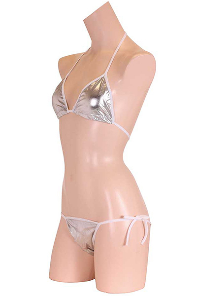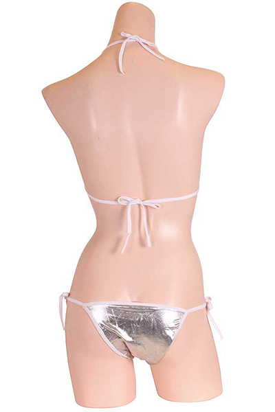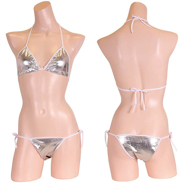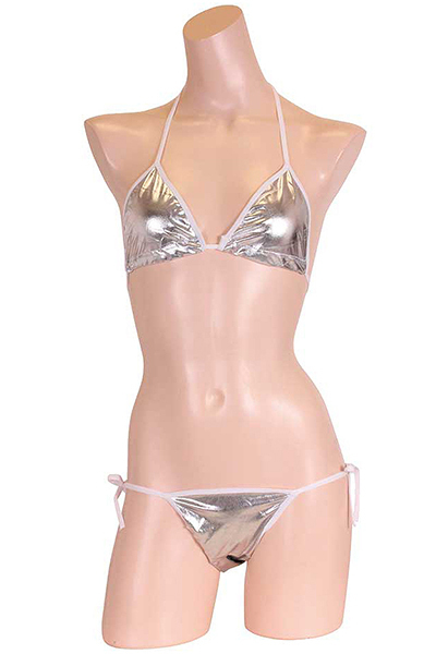 夏の浜辺でクールにキメる!上品な輝きを放つメタリック生地のシルバービキニ。セクシーな紐ビキニで大胆ショット♪生地特有のキラキラとした煌めきが貴女を海辺で輝かせる!※こちらの商品は受注発注商品の為、ご注文から発送までに3、4営業日掛かる場合が御座います。