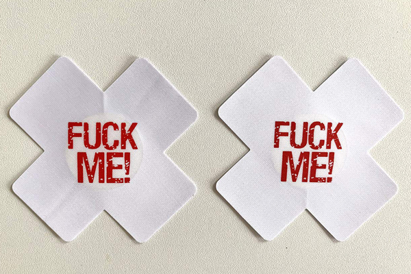 こんな風に主張されたらたまらない!「FUCK ME!」と大胆にアピールする2枚1セットのニップレス(白)。バッテン型のニップルシールが貴方の秘めた想いを叫ぶ!乳首に触れる中央部分には肌保護として粘着しない素材を使用しています。擦れ・透け防止にも◎