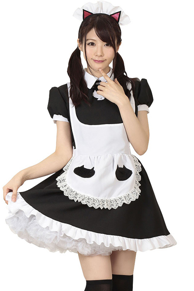 家内安全を招く黒猫メイド♪猫マークを至る所にちりばめた可愛いメイドコスプレ。白エプロンや胸元、カチューシャにも猫!可愛いが詰まった愛嬌たっぷりの萌え系コスチュームです。しっぽ付属
