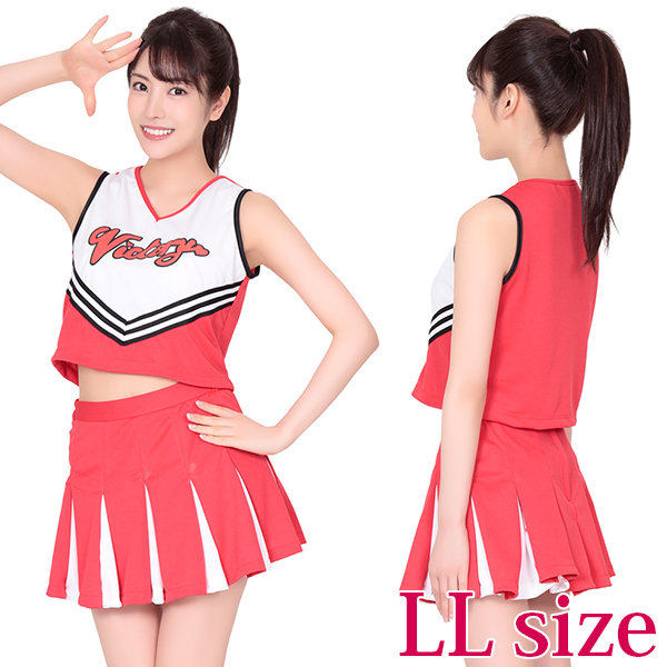 勝利へ導く可愛いチアに変身!大人気ロングセラーのチアガール衣装に大きめサイズが登場しました♪胸元には大きく「VICTORY」の文字をプリント!情熱的な赤が青空に映えるチアガールコスプレ。くるりと回れば赤白のミニ丈プリーツスカートか華麗に広がります♪