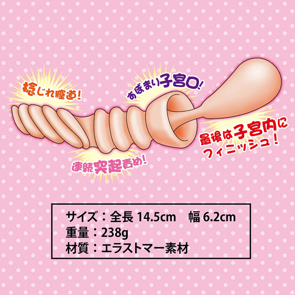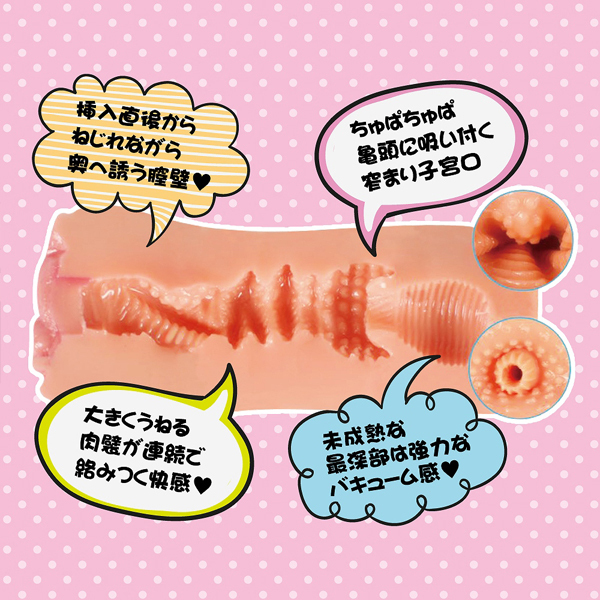未経験の初々しいアソコを貴方の手で開発!全体を締め付け刺激する非貫通オナホ。硬く閉じた入口を押し広げると、渦巻くスパイラル膣道が貴男を奥へ誘い、うねる肉壁が連続で刺激、キュンと締まる子宮口がチュパチュパと亀頭へ吸い付きます♪未だ成熟していない最奥の強力バキュームで絶頂へ!ローション付属