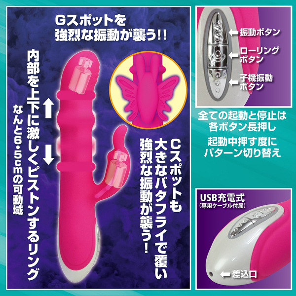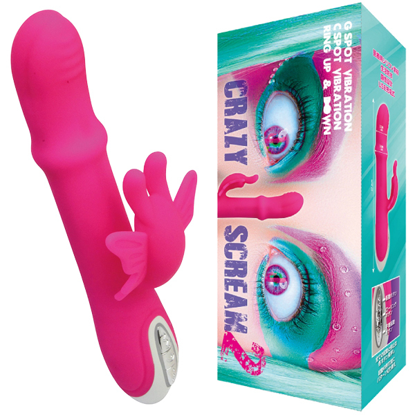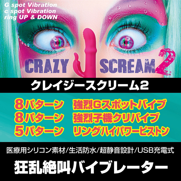 あまりの快感に女性が乱れまくると好評のバイブ「CRAZY SCREAM」に第2弾が登場!バタフライ型の子機が特徴的なUSB充電式バイブ。今作もクレイジーなアクション満載♪Gスポ振動8パターン×子機振動パターン8種類×5種類のピストンの3拍子でイキ狂わせる!素材には医療用シリコンを使用、お手入れ簡単な生活防水仕様。
