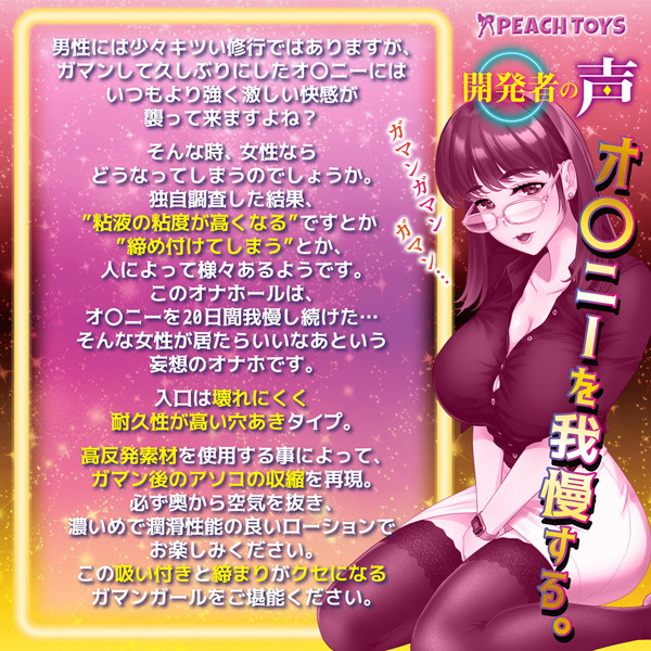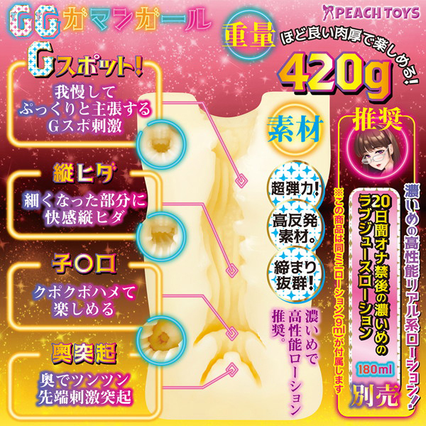 我慢を重ねた女性の膣内を再現した420gの肉厚オナホ。高弾力でハリがあり締まりも抜群!耐久性が高いので奥までしっかりお楽しみ頂けます。ぷくっと膨らむGスポや先っぽを咥え込む子宮口、そして先端をつつく奥突起で貴方の精を搾り取る!高粘度ローション付属。本品と合わせて「20日間オナ禁後の濃いめのラブジュースローション(b30081)」も是非どうぞ♪日本製、非貫通