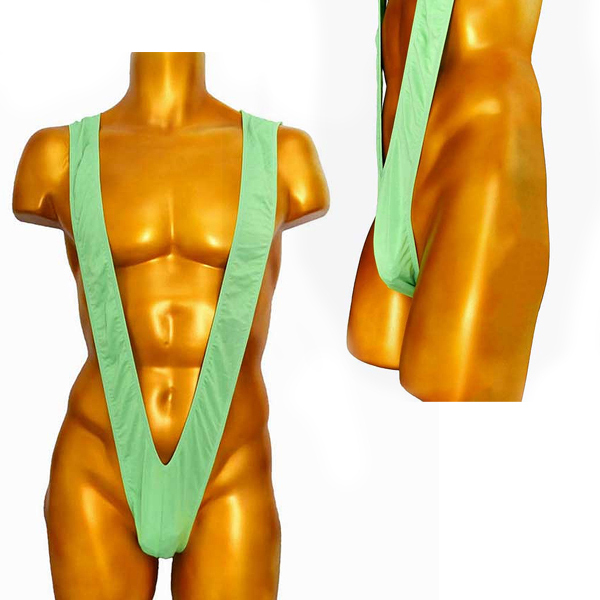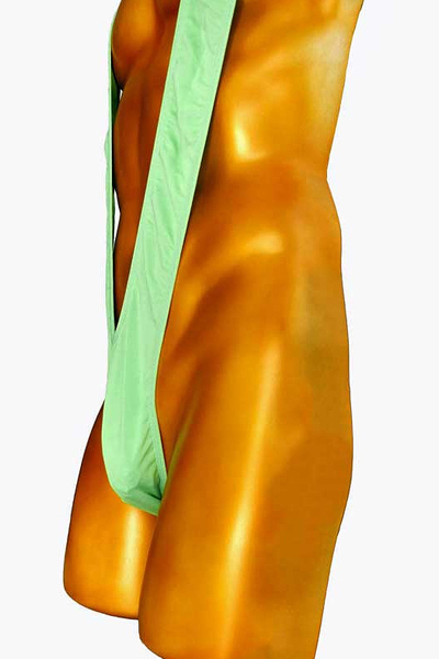 逞しい身体を強調する爽やかな男性用スリングショット。股間から背中へ回り込むように大きくV字に走る生地で筋肉を猛アピール!シンプルでオーソドックスなタイプのマンキニです。グリーンカラー、フリーサイズ