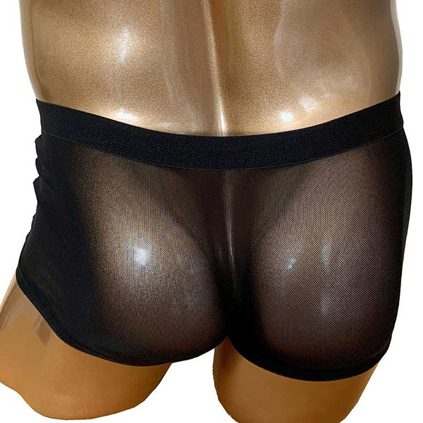 サイズアップした状態でもしっかりホールドする男性用シアーボクサーパンツ。フロントに余裕を持たせているため、通常時から高まった時まで変わらない着心地♪涼し気で通気性の良いメッシュ生地仕様なので、蒸れで肌に張りついて困っているという方にも最適です◎ブラックカラー、フリーサイズ