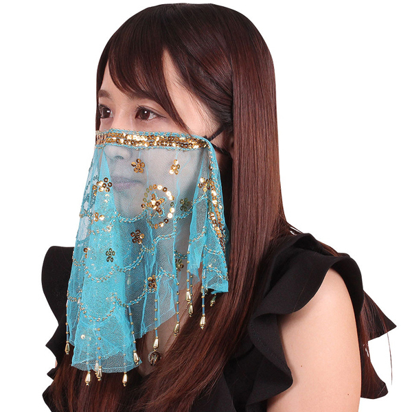 通気性の良いシアー素材で仕立てたサックスブルーの涼し気なフェイスベールマスク。キラキラと光るスパンコールを装飾した美しいデザインは、煌びやかで幻想的なアラビアンな世界を彷彿とさせます♪飲食しやすく相手に表情を伝えやすいので、接客業の方はもちろん、ビアガーデンの衣装小物として、ベリーダンスや舞台などの衣装に最適です。不織布フィルター1枚付、耳紐長さ調整可能※こちらの商品は受注発注商品の為、ご注文から発送までに3、4営業日掛かる場合が御座います。