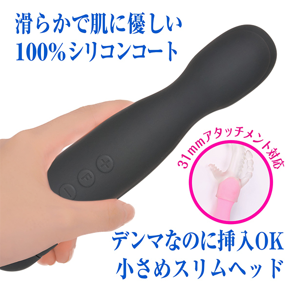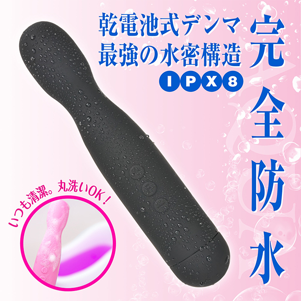 最高レベルIPX8等級の完全防水製で入浴しながら楽しめる電池式デンマ。多くの女性を快楽へと導いてきたピンクデンマシリーズ新作!全長19.2cm、ヘッド幅3.4cmと細身に設計することで挿入を可能に◎デンマならではの強力振動を12段階搭載し、更にリズム振動は10パターン!当てても入れても楽しめる高機能デンマはプレゼントにも最適です。単4電池を4本使用、ブラック