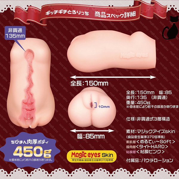 部位ごとに感触が変化するウェーブ形状の非貫通オナホ。肌は伸縮する柔軟素材を、中はピンクでねっとり絡む粘膜を再現し、膣内全体にはギチギチと締め付ける高弾力素材を使うことで純潔感をアップした特殊3層構造仕立て!入り口はわずか1cmながら、柔軟素材でしっかり伸びてとっても丈夫♪人気素材マジックアイズスキン仕様で、肉厚な450gのボリュームボディ。ローション付