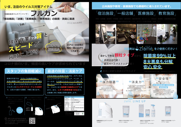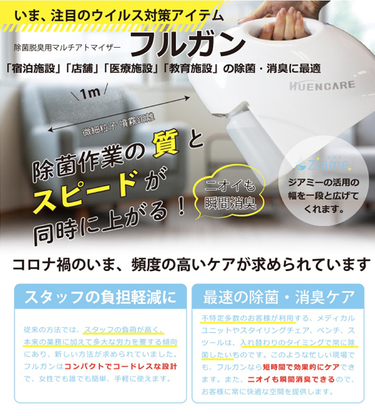 気になるウイルスや菌対策に、除菌脱臭用マルチアトマイザー「フルガン」。重量1.3kg、人間工学に基づいた手に馴染みやすいデザインで、片手で簡単に持ち運べるコードレスの軽量タイプ!噴霧距離は約1m、1時間20分以上の充電で約1時間の連続稼働が可能。微細粒子がお部屋の隅々まで行き届き、広範囲を効率的に除菌剤でケアします◎ご自宅だけでなく、ホテルや風俗店舗様にも。 ※こちらの商品は受注発注商品の為、ご注文から発送までに3、4営業日掛かる場合が御座います。