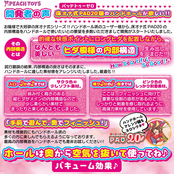 床オナ式シリーズ最新作は手前で感じて奥でイクッ!前作「床オナ式PAD20(b30357)」のハンディサイズが欲しいという声から生まれた肉厚550gの非貫通オナホ。肉厚感を重視し一穴で設計!前半3分の2は桜色の絡むように柔らかい素材を、残りの部分には高弾力な素材を使用したハイブリッド仕様♪素材の質感とヒダ模様で的確に刺激します。ローション付き