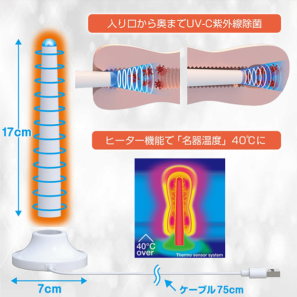 オナホウォーマーの悩みをまとめて解決!超強力UV−C除菌でクリーン&ホットなオナホを今すぐご提供!ケーブルのわずらわしさから解放するコードレスな魔法のスティックです!超強力UV−Cで除菌はばっちり。充電式コードレスで、どこにでも持ち運べて、しかも温度センサー内蔵だから、たった5分で人肌温度にしたあとは放置OK。