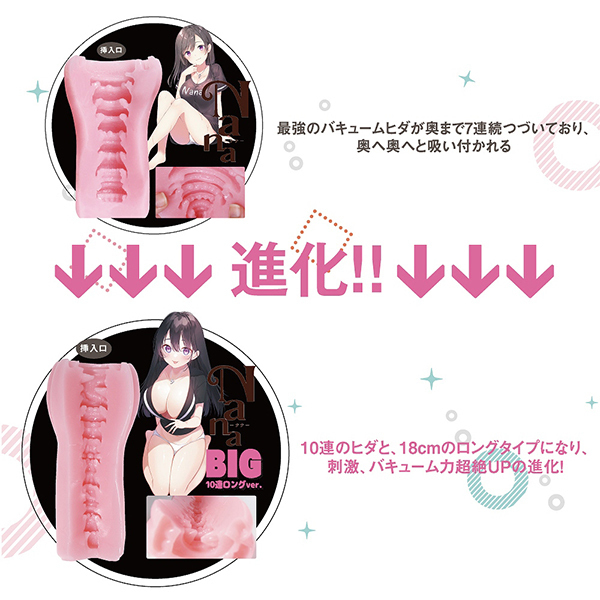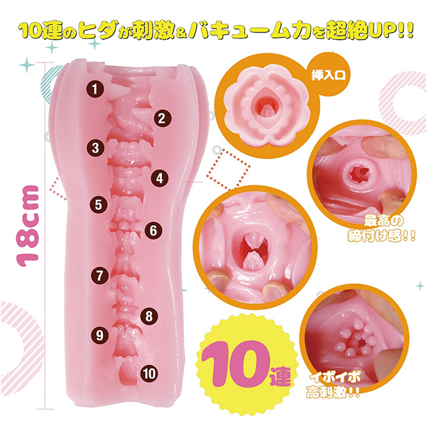 これまでにない新感覚!なんと10連続する逆テーパー型に配置された内部のヒダギミックが特徴の非貫通オナホ「NaNaBIG10連ロングver」です。ロングサイズのオナホで個性的なヒダ形状が気持ちいい♪筒型のアウターはフロント部分に膨らみがあり、蕾のような感じでスリットが入っていたりと印象的!挿入口も独特で、くぱぁされたような個性的な形状を楽しみつつ、内部のイボリングがアクセントとなるキツ狭な最奥でイッちゃいます♪最奥付近では疑似子宮っぽい仕掛けが待ち受けており、全部で10連続するユニークなヒダを存分に堪能できる逸品となっています。ストローク感をたっぷりとお楽しみください!