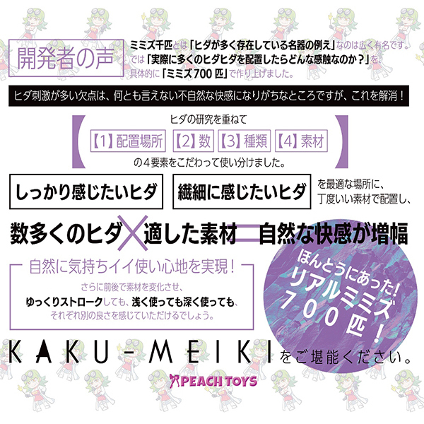 700本もの多彩なヒダを贅沢に配置した非貫通オナホ「カクメイキミミズナナヒャク」です。きわどい刺激やほどよいゾリ感が味わえる!ハンディサイズで名機と呼ばれるミミズ千匹を極めた搾精力もヒダヒダも迫力満点なオナホです♪シンプルな筒型のフォルムにポチ穴挿入口!ホールの後半部分ではマッタリ系の柔らかで半透明な素材を採用し、バキューム効果もしっかり味わえます♪挿れた直後から感じられる大胆なギミックにコブ表面の細かなヒダ!2つのギミックが心地よく刺激してくれるヒダ壁と半透明な素材ゾーンでの3面によるトライアングル構造が、これまでにない演出と快感を存分に味わわせてくれます。素材感、ヒダの配置、ヒダ数、ヒダの種類と4つの点にフォーカスし、どこの挿入位置からでも究極のヒダ刺激が堪能できるオナホールとなっています♪