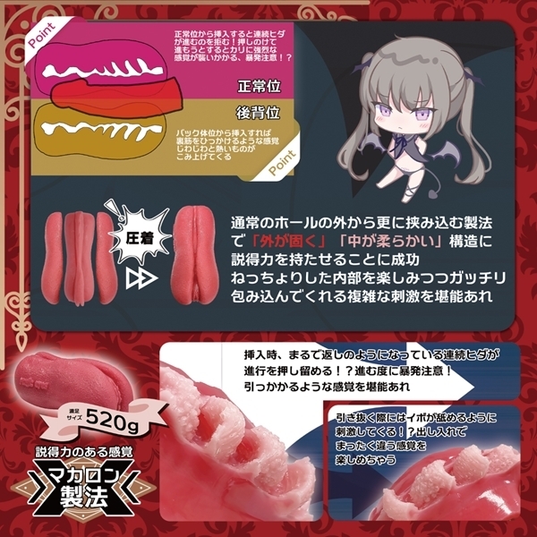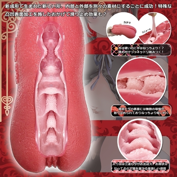 柔らかいオナホを外側から硬めの素材で圧着した非貫通オナホ「ハードカバーなトロトロ生膣マカロン」。内側と外側が別々のパーツで成形された「マカロン製法」だからこそ実現した使用感が新鮮です!中はフワフワだけど外はしっかりとしたハードカバータイプ。内部には粘膜層もあり3種の素材で構成されています♪大きな三連返しヒダと細かなイボは上下を逆転させる事で全く異なる使用感!520gの大型ボディの素材には厚生労働省、食品衛生法第370号に準拠した「Magiceyes Skin」を採用しているので安心してご使用頂けます。ローション付属