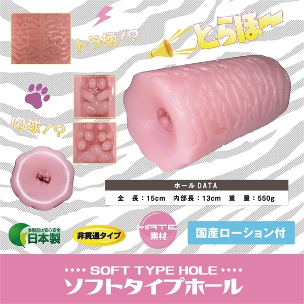 みんなも一緒にとらほ〜しよう♪ソフトタイプホール。●上下からのイボ刺激●3方向から包み込むコブヒダ●ウラスジはv字型突起が刺激●先端は不規則な突起で刺激。ローション付、日本製