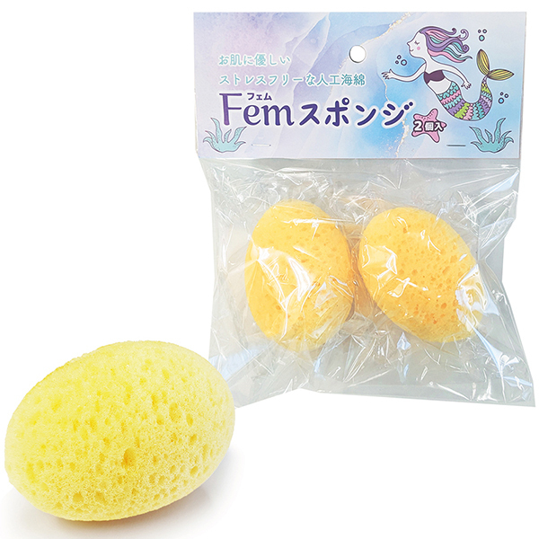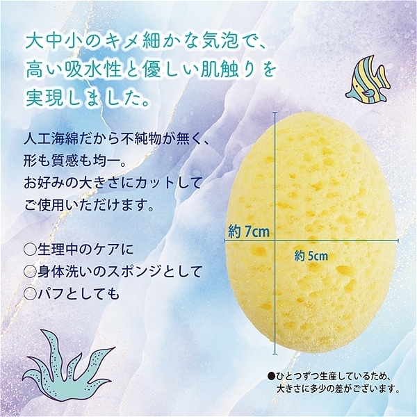 天然海綿を模して成型した、吸水性の高い人工海綿です。個人で購入しやすい、個包装を2個セットにしました。大きさは大粒で、形も均一なのが特徴です。大中小の不揃いの気泡を作ることで吸水性を高め、優しい肌触りに仕上げました。海から採れる天然の海綿と違い、貝殻や海草、微生物などの不純物もなく安心して清潔にお使いいただけます。長さ約7cm、直径5cm。