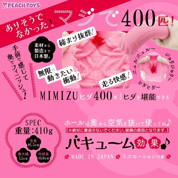 KAKU−MEIKIシリーズの「ミディアム」バージョン「KAKU−MEIKI MEDIUM ミミズ400」が登場!ミミズ千匹とは「ヒダが多く存在している名器の例え」なのは広く有名です。では「実際に多くのヒダヒダを配置したらどんな感触なのか?」を、艶やかに「ミミズ400匹」で作り上げました。無数に配置されたヒダが包み込みながら挟み込む!●STD