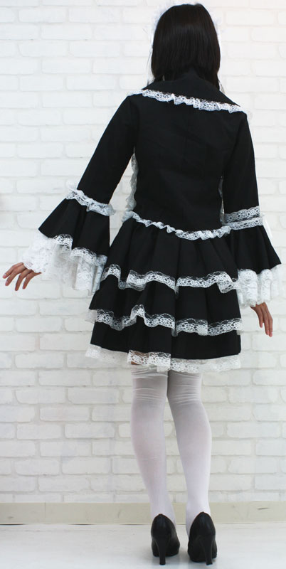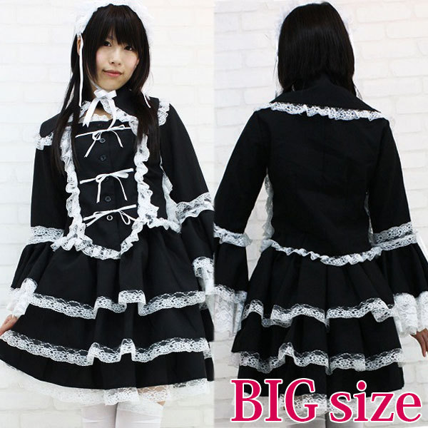 BIGサイズ:B85〜90cm・W90〜116cm 丈:上着53cm(袖65cm・肩幅39cm)・スカート48cm セット内容:ジャケット(前ボタン留め、姫袖)・別衿・ヘッドドレス(総レース仕様、バラのコサージュ付き)・スカート(ウェストゴム入り)